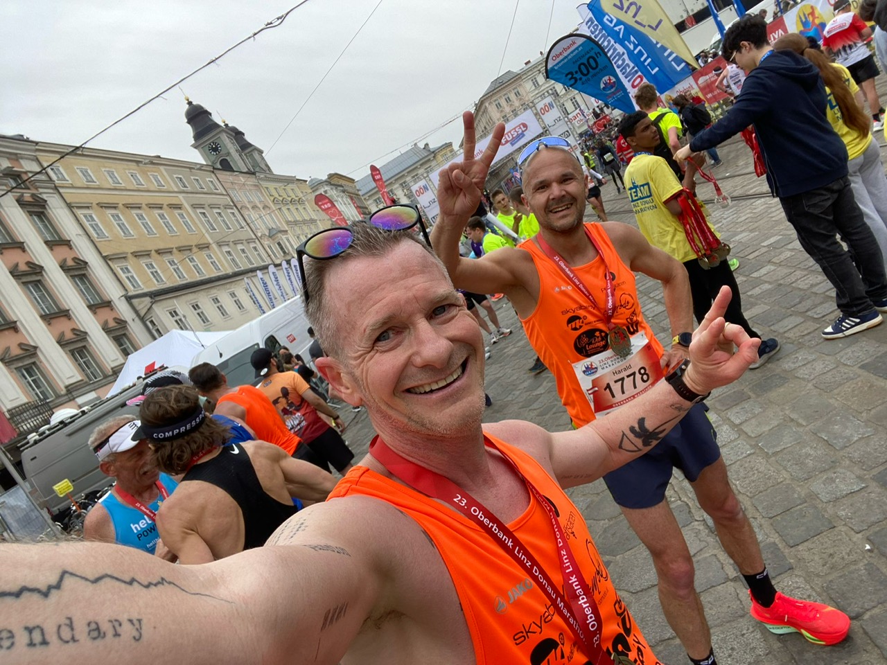 Und weil die Königsdisziplin im Laufsport besonderen Vorkehrungen bedarf, machte sich die 6 Köpfige Abordnung der Sportunion Pfaffstätten, geschlossen schon am Vortag auf um die ideale Vorbereitung zu haben und nichts dem Zufall zu überlassen. Harald reiste mit der Familie schon am Freitag an – man kann auch gut Urlaub machen in Linz, außerdem waren die Kids auch am Start. Susi und Anna-Lena fungierten einmal mehr als tolle Fotografen und Fans am Streckenrand – Dank für dieses tolle Service! Christian und Stefan machten nach einer kleinen Aktivierung (6 Km laufend) Linz mit dem Fahrrad unsicher. 2/3 der Strecke konnten so gut besichtigt werden.
