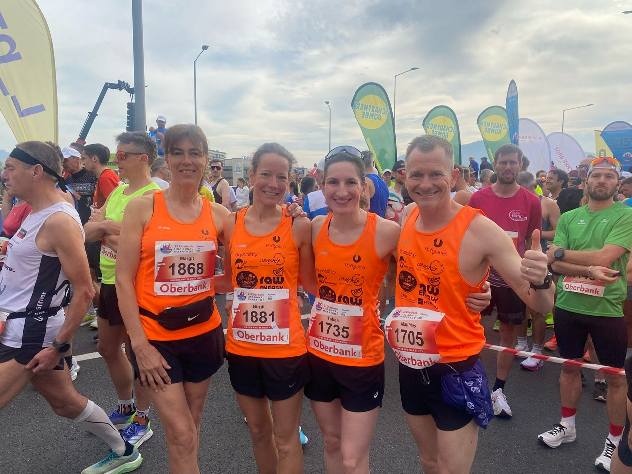 Am Start ein volles Damen Team bestehend aus Tabea Fian, Birgit Weißmann und Margit Tugay, sowie dass Herren Team, Stefan Winkelmayer, Matthias Bauer und Harald Kolm starteten in Orange auf das Abenteuer der 42,195 Kilometer. Ideale Bedingungen (Start 9 Grad bewölkt kaum Wind, Ziel 16 Grad bewölkt – Wind nur von den jubelnden Menschenmassen) herrschten an diesem Tag, die tolle Ergebnisse vor allem unser Athlet:innen zur Folge hatten:
